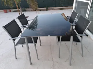 Conjunto de mesa con superficie de cristal y cuatro sillones, ideal para exteriores. - Mesa con sobre de cristal. - Estructura de los sillones y mesa de metal. Las sillas son apilables A recoger por comprador