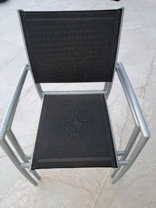 A recoger en Lorca (Murcia) Conjunto de 8 sillas apilables, ideales para exterior. Su diseño permite un fácil almacenamiento. - Estructura de metal. - Asiento y respaldo en tela.