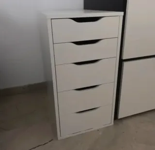 Cajonera de cinco cajones de la serie ALEX de Ikea. Su diseño moderno y funcional la hace perfecta para organizar cualquier espacio. - 5 cajones amplios. - Tiradores integrados para un fácil acceso. - Acabado liso y fácil de limpiar.