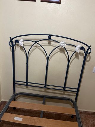 Estructura de cama de forja con un diseño elegante y detalles decorativos en el cabecero. - Cama con somier de láminas de madera. - Estructura metálica resistente. - Diseño ajustable en largo.