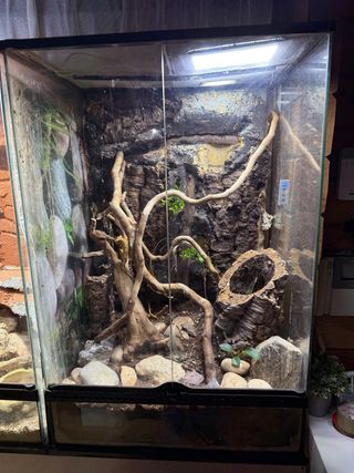 Terrario Exo Terra con diseño de paisaje rocoso y ramas. - Fondo texturizado de corteza de corcho. - Varias ramas para trepar. - Base con sustrato y rocas decorativas. - Foco led Medidas: Alto 92cm Ancho 62cm Fondo 45cm