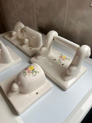 Conjunto de accesorios para el baño en cerámica con un delicado diseño floral. - Incluye portarrollos, jabonera, portacepillos de dientes. - Acabado blanco con detalles florales multicolores. 8€con envío 5€ entrega en mano
