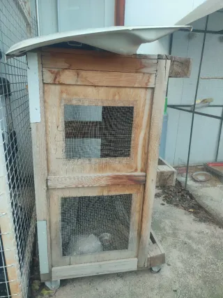 Pajarera de madera con malla metálica, ideal para aves. - Estructura de madera. - Malla metálica resistente. - Bebedero amarillo incluido. Ideal para criar canarios, ninfas, periquitos .... Está bastante bien, el tejado habria que reparalo.