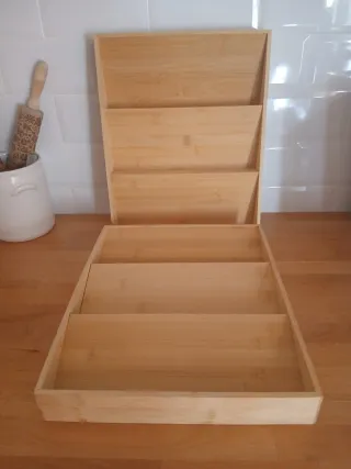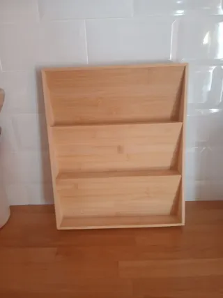Organizador de especias de bambú con diseño escalonado. - Material: Bambú natural. - Diseño de 4 niveles. - Ideal para organizar frascos de especias. Precio por unidad.
