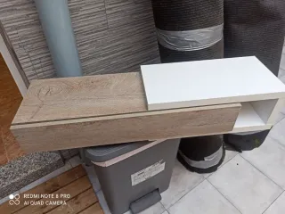Mueble de diseño moderno, ideal para recibidores o salones. - Acabado en madera y blanco. - Combina un cajón y un hueco abierto para almacenamiento.