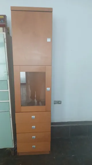 Vitrina de madera con puerta de cristal. - Diseño elegante y funcional. - Estantes interiores para exhibición. - Cajones inferiores para almacenamiento.