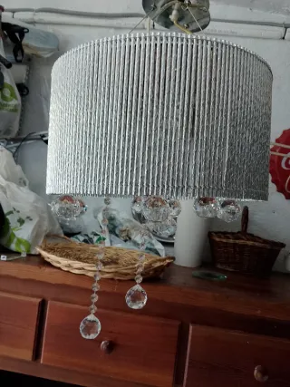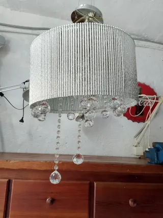 Elegante lámpara colgante con un diseño moderno y sofisticado. Aporta un toque de luz y estilo a cualquier estancia. - Estructura cilíndrica con varillas metálicas. - Adornos de cristal facetado. - Cadenas de cuentas de cristal.
