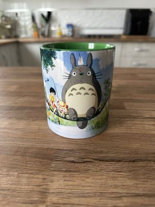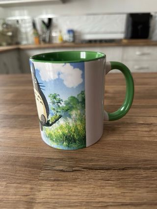 Taza con diseño de Totoro, personaje icónico del Studio Ghibli. Ideal para los amantes del anime. - Diseño detallado con Totoro y otros personajes. - Interior de color verde vibrante.
