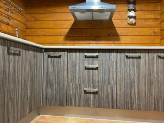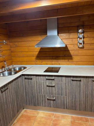 Conjunto de muebles de cocina con un diseño moderno y funcional. - Acabado en madera y detalles metálicos. - Encimera resistente. - Incluye campana extractora y vitrocerámica.