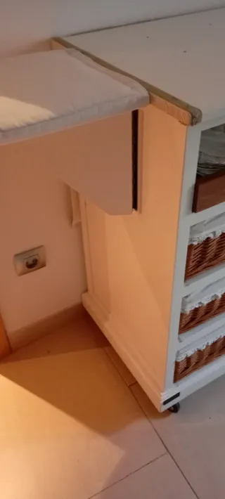 Mueble auxiliar para planchar y organizar. - Incorpora un tablero extensible para planchar. - Dispone de tres cestas de mimbre. - Cuenta con un cajón superior. - Un compartimento con puerta. Está enmperfecto estado. Incluye dos juegos de fundas para planchar. Es de madera de pino maciza, muy robusto. Se hizo a medida por un carpintero. No la envío, porque pesa mucho y al tener ruedas seguro que llega roto.