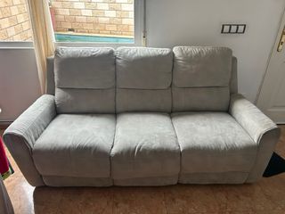Cómodo sofá reclinable de dos plazas, ideal para relajarse. Su diseño se adapta a cualquier espacio. - Tapicería de tela. - Color beige y gris.