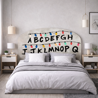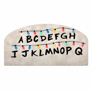 Cabecero de cama con diseño impreso inspirado en Stranger Things. Presenta las letras del abecedario y luces decorativas. Tenemos otras medidas....72cm x 145 cm| 129€ se podria fabricar otras medidas personalizadas Cabeceros de cama de impresion directa en aluminio composite 3mm, envios gratis a toda españa. - Diseño de luces de Navidad. - Estampado del abecedario. - Forma arqueada.