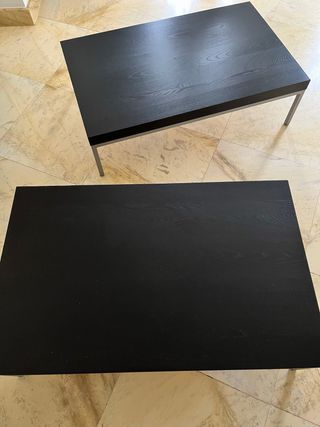 Pareja de mesas auxiliares/de centro en perfecto estado Vendo este conjunto de dos mesas bajas con acabado en color negro y un elegante veteado efecto madera. Son ideales para el salón, como mesas de centro frente al sofá o para crear una zona de descanso moderna. Cuentan con una estructura de patas metálicas finas que les da un aspecto ligero y contemporáneo. Medidas de cada mesa: • Largo: 97 cm • Ancho: 60 cm • Alto: 27,5 cm (Altura baja, estilo "lounge") Estado: Muy bien cuidadas, sin golpes importantes. No realizo envíos de este articulo por volumen.