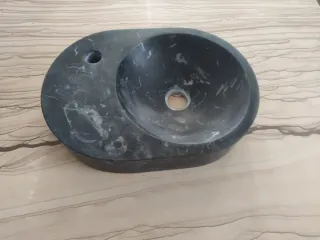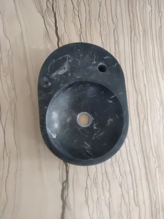 Lavabo sobre encimera de mármol Negro Marquina, con acabado apomazado. Diseño elegante y moderno, ideal para baños contemporáneos. Medidas: 45,5 x 33 x 9,5 cm Piedra natural Pieza única Entrega en mano o consultar