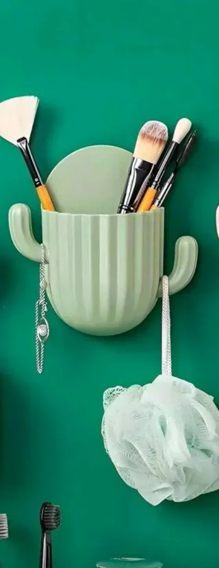 Este estante con diseño de cactus es un accesorio divertido y práctico para tu hogar, ideal para organizar pequeños objetos. Medidas 14,5 x 14,5 cm Viene con un adhesivo para colocarlo en la pared u otra superficie. Dispongo de dos unidades. El precio es por unidad. Cepillo dientes baño lavabo jabonera pincel