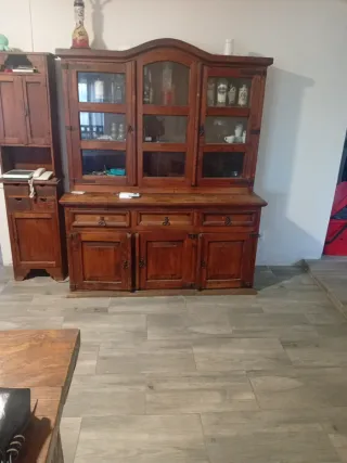 Mueble de madera con vitrina y cajón