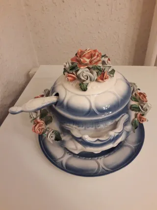 Conjunto de olla sopera con su plato y cuchara, decorado con flores. - Diseño floral en relieve. - Acabado en cerámica. Perfecto estado de conservación. Solo venta en mano