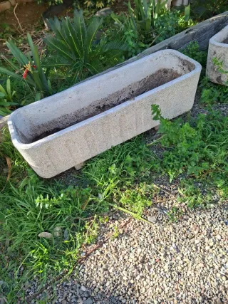 8 Maceteros o Jardineras de piedra. 15 € la unidad o 100€ todas. Preguntar sin compromiso. Medidas: Macetero rectangular Ancho:22cm Alto: 20cm Largo: 60cm Profundo: 14cm Macetero redondo Alto: 26cm Profundo: 25cm Diámetro: 32cm
