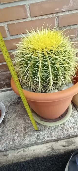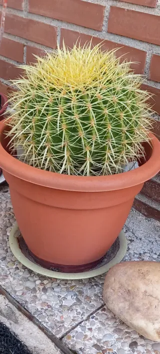 DISPONIBLE HASTA ÚLTIMOS DE MARZO. Este cáctus esférico es una planta llamativa y de gran tamaño. - Tiene más de 10 años. - Está siempre a la intemperie. Muy resistente y fácil de mantener. - Forma redonda y compacta. - Espinas amarillas y blancas. - Maceta incluida.