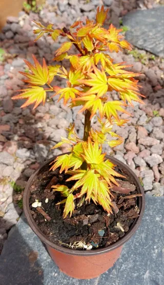 Arce japonés Orange dreams con hojas de tonos amarillos y rojizos. -Altura con maceta 26 cm -Sin injertos -Ideal bonsai , arbusto o arbol
