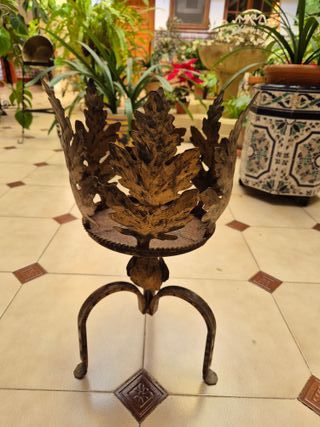 Elegante portamacetas de metal dorado envejecido. - Cuerpo formado por 6 hojas de roble. - Base apoyada sobre tres patas curvas para mayor estabilidad. - Entre la base y las patas tiene otras 3 hojas decorativas más pequeñas. - La base (foto 4) tiene dos pequeños agujeritos de 1 milímetro casi imperceptibles. Buen estado teniendo en cuenta que se trata de un objeto metálico antigüo y presenta una pátina acorde con ello. - Medidas: diámetro 19,5 cm en la base y 25 cm en la parte alta. Altura 48 cm