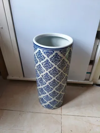 Elegante paragüero con diseño de azulejos en azul y blanco. Perfecto para dar un toque decorativo a la entrada de tu hogar. Tiene un pequeño roto en la parte inferior que no se ve a simple vista y tiene una maceta dentro para que no tire el agua por el agujero. - Diseño clásico de azulejos. - Color blanco con detalles en azul. - Forma cilíndrica.