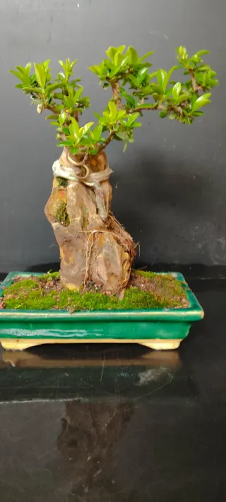 Precioso bonsái de piracanta cultivado sobre una roca. - Planta de bonsái. - Roca decorativa. - Maceta verde.