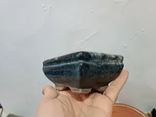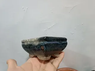 Pequeña maceta cuadrada para bonsái, con un acabado esmaltado en tonos azules y detalles en terracota. - Diseño de cerámica con base de terracota. - Forma cuadrada con patas.