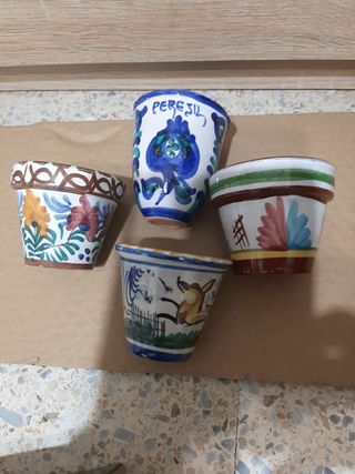 Conjunto de macetas decorativas con diseños variados. Todas por 1€ unidad. Sueltas a 2€. - Piezas de cerámica y terracota. - Colores vibrantes y acabados únicos.