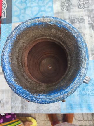 Maceta antigua con un diseño único y llamativo. Su forma y acabado la convierten en una pieza decorativa especial. - Acabado esmaltado brillante. - Detalles de pintura verde. - Base estable.