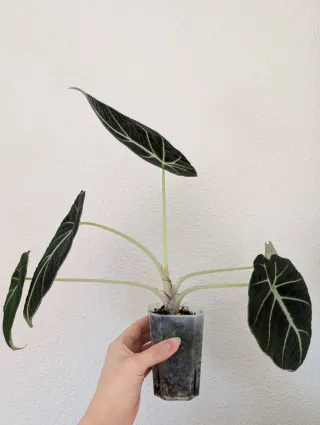 Planta Alocasia Black Velvet con unas preciosas hojas aterciopeladas verde oscuro y venas marcadas. Planta bien establecida, tiene 5 hojas y al menos 3 cormos en la tierra. Con sustrato especial para tropicales y maceta especial para aráceas transparente que permite ver el estado de las raíces. Actualmente está en invernadero con muy alta humedad.