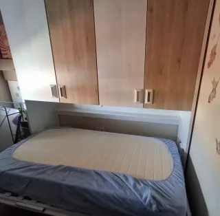 Mueble funcional con cama abatible integrada. Ideal para optimizar espacios. - Diseño moderno. - Combinación de colores blanco y madera. - Ideal para pisi - En perfecto estado - Se vende por que necesitamos 2 camas - El colchon no entra en el precio.