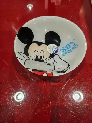 Plato hondo con diseño de Mickey Mouse. - Ilustración de Mickey Mouse. - Frase Say Cheese! en el interior. - Borde con detalles rojos y blancos.