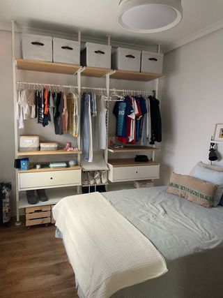 Sistema de almacenaje modular con tres secciones. Ideal para organizar ropa y accesorios. - Estructura metálica. - Estantes de madera. - Diseño moderno y funcional. Altura para techos de 220 hasta 350 segun ficha, cajas superiores no incluidas