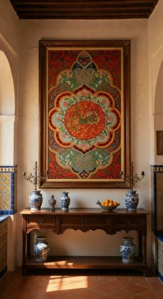 Cuadro decorativo con un diseño inspirado en el castillo de Alhambra de Andalucía y su arte islámico en el siglo 13, hecho a mano por una artista universal, firmada por Tahany 2025. Si quiere ver el cuadro entero mandame un mensaje por aquí. - Motivos florales y geométricos. - Tonos vibrantes de rojo, dorado, morado, azul y verde. - 160x70x1