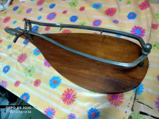 Soporte jamonero con base de madera y estructura metálica. - Base de madera con forma. - Soporte metálico con cadena y pinchos.