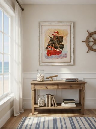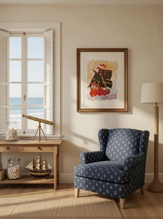 Representación artística de un barco de vela, con detalles en madera y tela. Ideal para coleccionistas o amantes del mar. - Velas con diseño a cuadros. - Casco principal en color rojo vibrante. - Detalles en madera en mástiles y cubierta. - Pintura de fondo que simula el mar y el cielo.