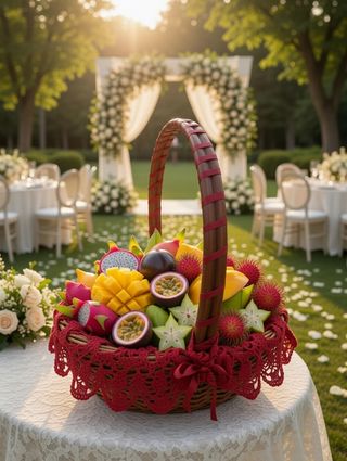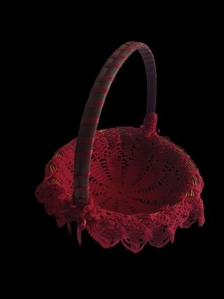 Cesta artesanal con un bonito adorno tejido. - Elaborada con mimbre y tela. - Diseño único con detalles rojos. - El tejido es fácil de quitar y poner. - Adornado con cintas decorativas. #CestaArtesanal #OfertaCestas #CestaDecorativa #Decoración #Decoración #Cestas