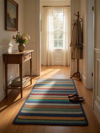 Tapiz o alfombra pequeña, ideal para dar un toque acogedor a tu hogar. Su diseño tejido a mano le confiere un carácter único. - Diseño de rayas multicolor. - Fabricación artesanal. - 86 x 52 cm