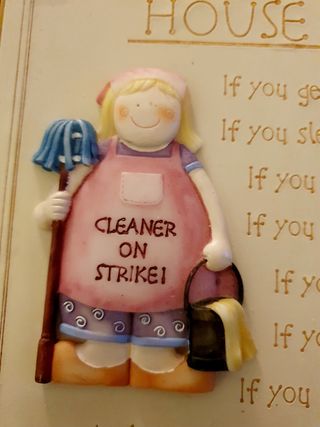 Un divertido letrero de Reglas de Casa con un diseño de limpiadora. - Texto principal: HOUSE RULES - Frase adicional: And remember--Mum is always right! - Figura decorativa de una limpiadora con un trapeador y un cubo. - 20x18.50 cm