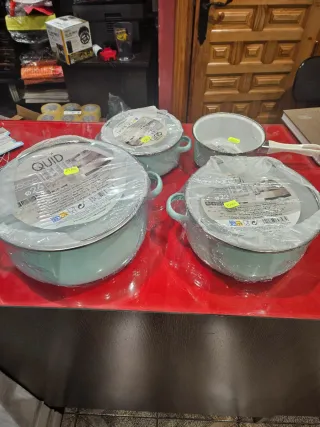 Conjunto de cacerolas en un bonito color verde menta. Son ideales para tu cocina. - Juego de varias cacerolas. - Acabado esmaltado. Aptas para toda las fuentes de calor, y con un bonito estilo vintage Composición 1 cacerola de 26 cm x 24,78€, 5 litros 1 cacerola de 22 cm x 17,20€ , 2,8litros 1 cacerola de 18 cm x 9 ,25€ 1,7litros 1 cazo de 16 cm x 8,75€ 1 litro Se puede adquirir todo el lote o por piezas sueltas solo me tienes que preguntar