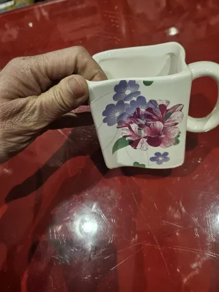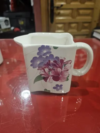 Bonita lechera con un diseño floral. - Diseño de flores moradas y blancas. - Asa lateral. - Borde con pico vertedor.