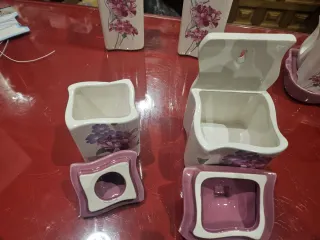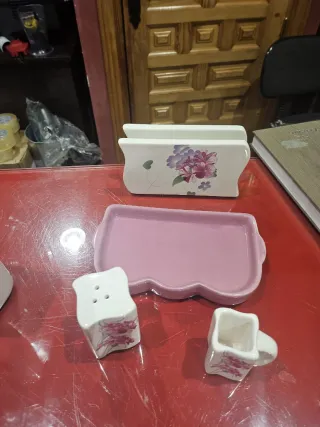 Conjunto de piezas de porcelana con un delicado diseño floral. - Tapa con forma de casita. - Motivos de flores en tonos rosas y morados. - Acabado brillante. Compuesto 1 salero pvp 8€ 1 azucarero pvp 8€ 1 lechera o cremera pvp 8€ 1Botella aceite pvp 8€ 1 Botella vinagre pvp 8€ 1 Bandeja con servilletero Palillero y salero o pimienta pvp 12€ Todo saldría por 52€ Es un resto de la tienda todo sin estrenar con su etiqueta