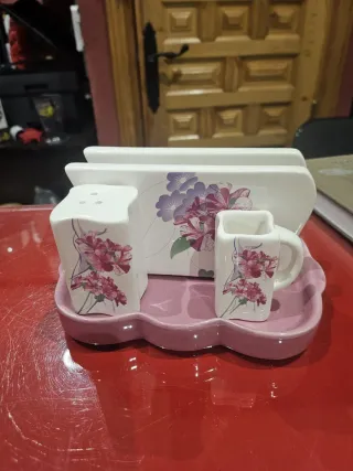 Este juego de mesa presenta un encantador diseño floral sobre una base de cerámica. - Incluye salero y palillero - Dispensador de servilletas. - Bandeja