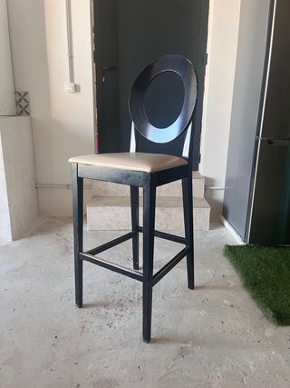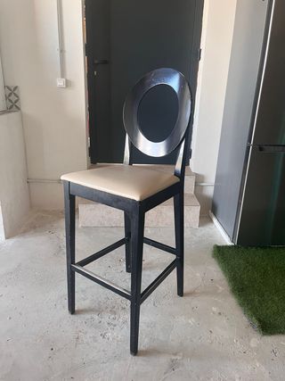 Taburete alto de madera con asiento tapizado en piel. - Diseño elegante y moderno. - Ideal para barras o mostradores. - Estructura robusta.