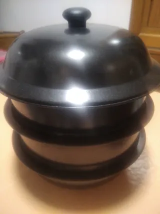 Olla para cocinar al vapor, con un diseño elegante y funcional, para cocinar varios platos a la vez, tiene un desconchón pero no afecta porque es donde va el agua. - Fabricada en metal y plástico. - Color negro.