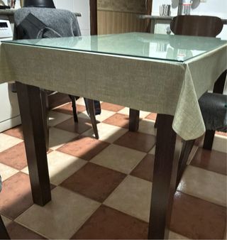 Conjunto de mesa y sillas para el comedor.Estan en perfecto estado y bien cuidadas. -4 sillas - Mesa con superficie de cristal. - Patas de madera oscura. - Sillas tapizadas en tela.