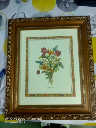 Bonito cuadro decorativo con un ramo de flores. - Marco de madera con detalles dorados. - Diseño floral multicolor.