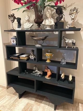 Vendo estantería decorativa grande de madera en color negro, ideal para salón, comedor o despacho. 146 cm largo 40 ancho 151 alto Tiene varios compartimentos para libros, fotos y objetos decorativos. Diseño moderno y elegante, muy estable y resistente. Buen estado general, con pequeñas señales normales de uso. 📏 Perfecta como librería o mueble expositor. ⚠️ Los objetos decorativos, jarrones, figuras y marcos de fotos NO están incluidos en el precio. Se venden por separado. Solo recogida en mano. Se puede ver sin compromiso. Precio negociable. Ver mis otros anuncios. Vaciado de casa completo, preguntar sin compromiso 😊