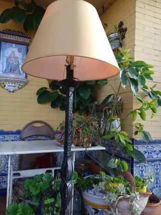 Lámpara de pie antigua de hierro y pantalla beige